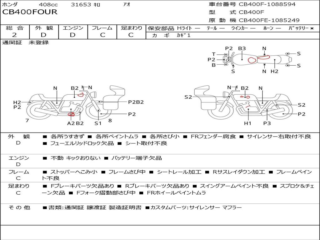 | Номер рамы / VIN | CB400F-1088594 |