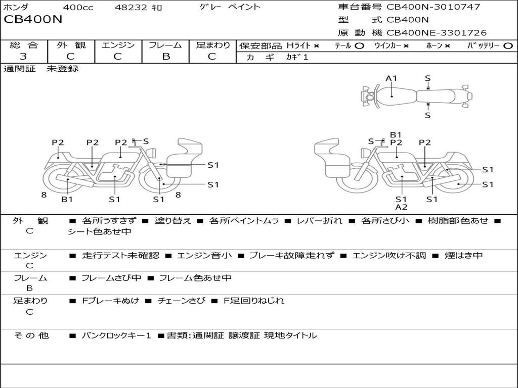 | Номер рамы / VIN | CB400N-3010747 |
