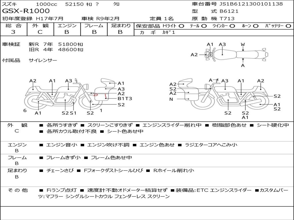 | Номер рамы / VIN | JS1B6121300101138 |
