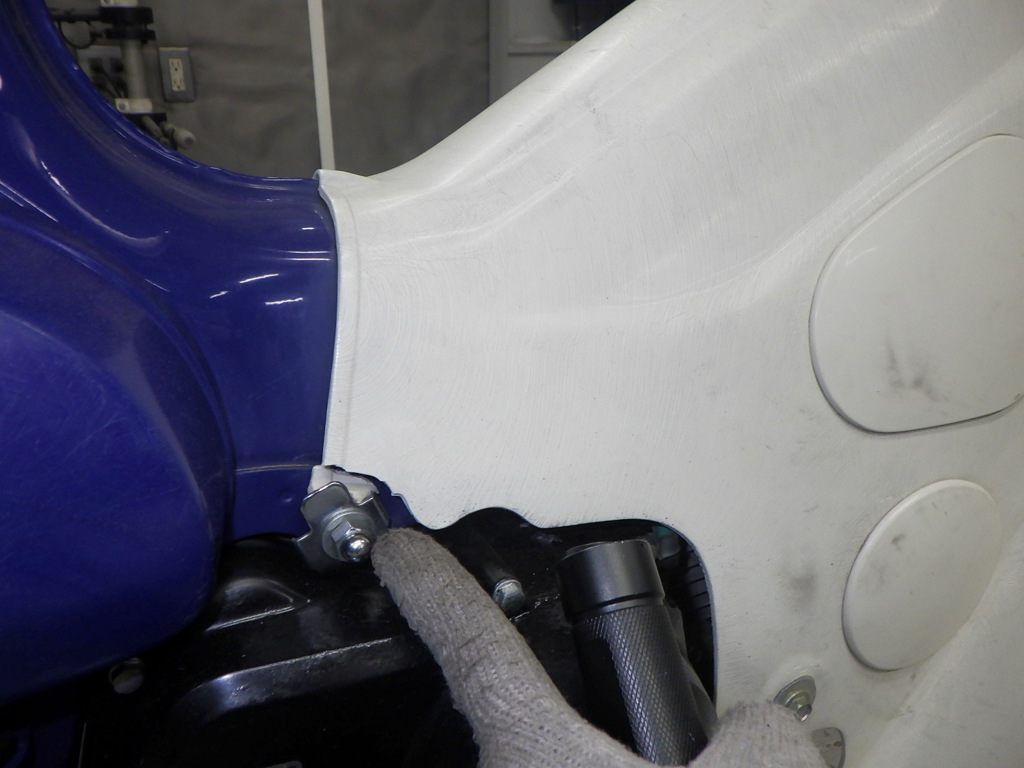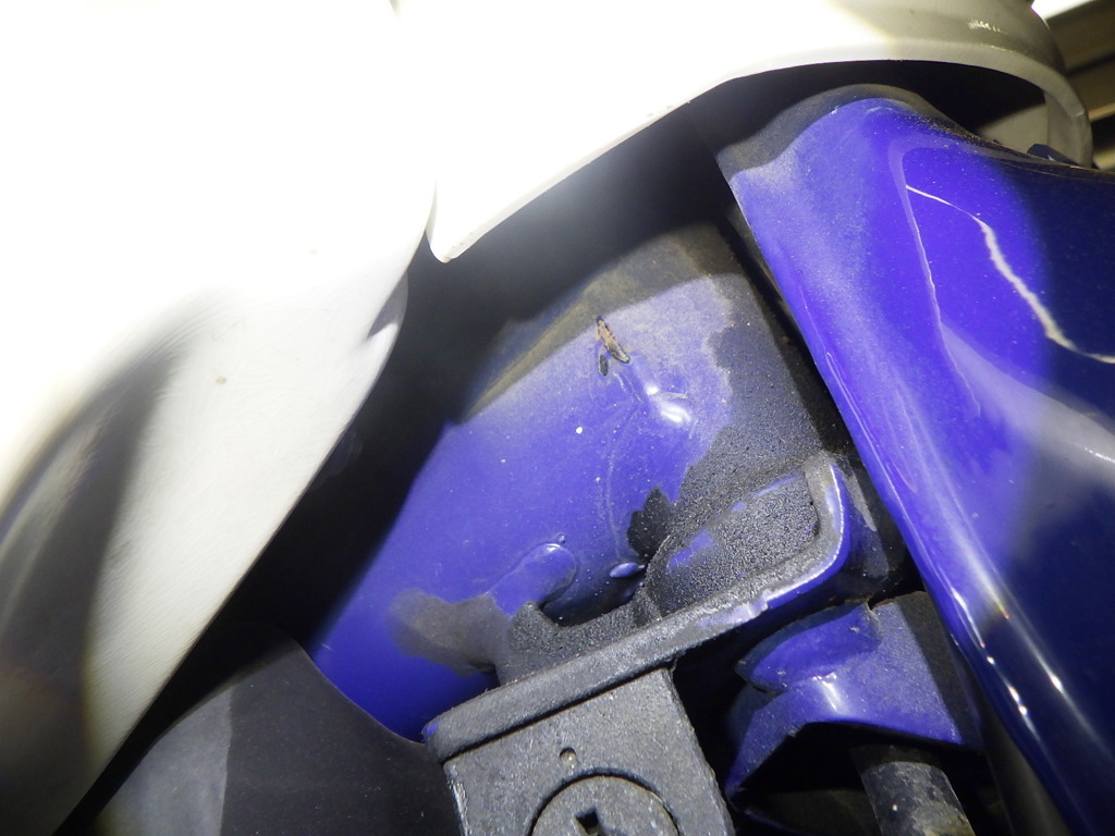 | снизу | деформация, подкрашено, скол краски <много>, трещины, повреждено и отсутствует <много>, неисправен шарнир |