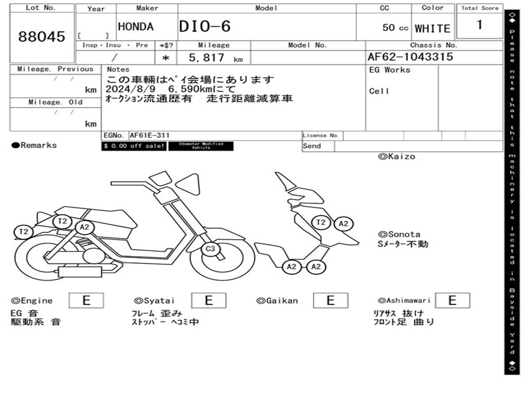 | Номер рамы / VIN | AF62-1043315 |