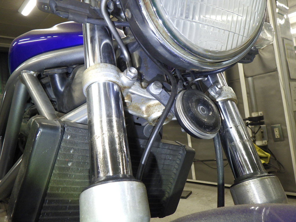 | внешняя часть вилки | следы коррозии <много>, полирован., потек масла <много>, неисправен сальник |
