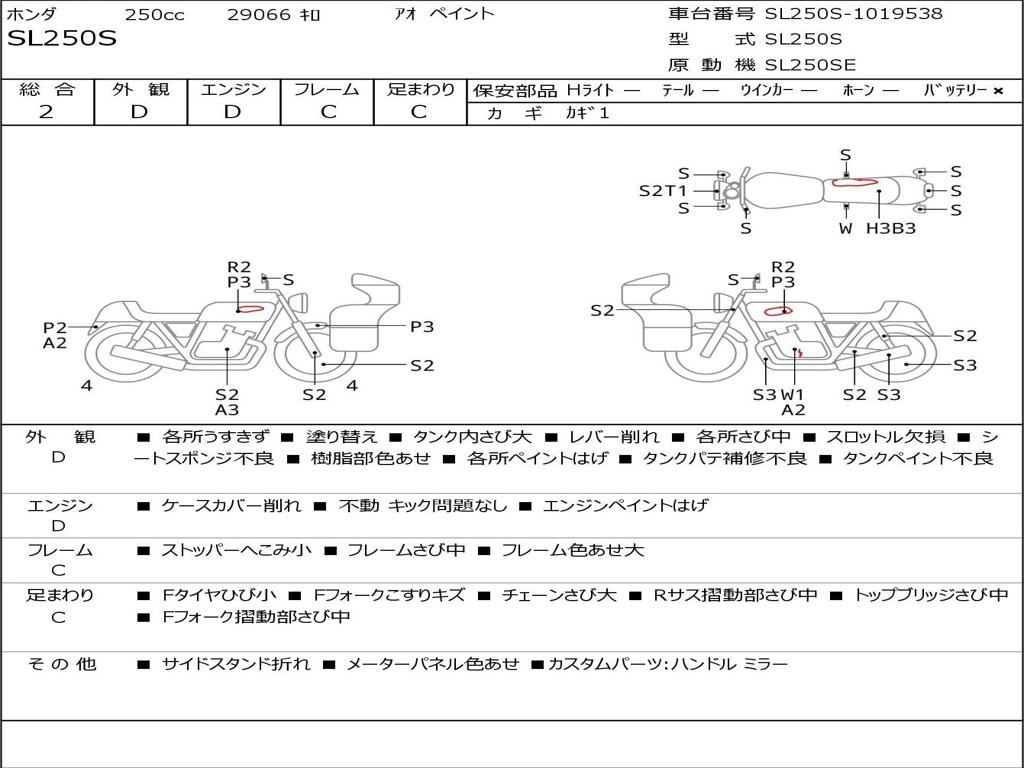 | Номер рамы / VIN | SL250S-1019538 |