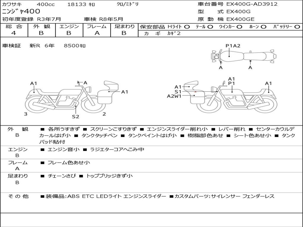 | Номер рамы / VIN | EX400G-AD3912 |