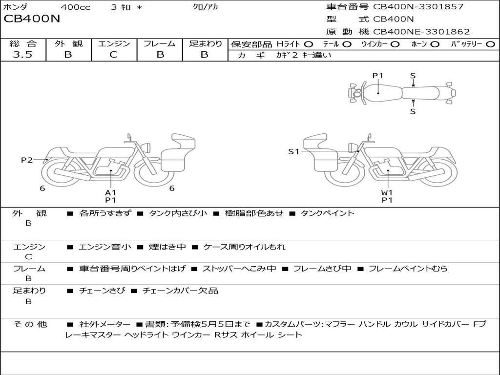 | Номер рамы / VIN | CB400N-3301857 |